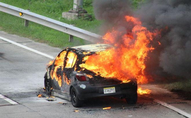Photographs of a sedan-type vehicle that burst into flames before exploding on Via Cincuentenario on the weekend have gone viral....