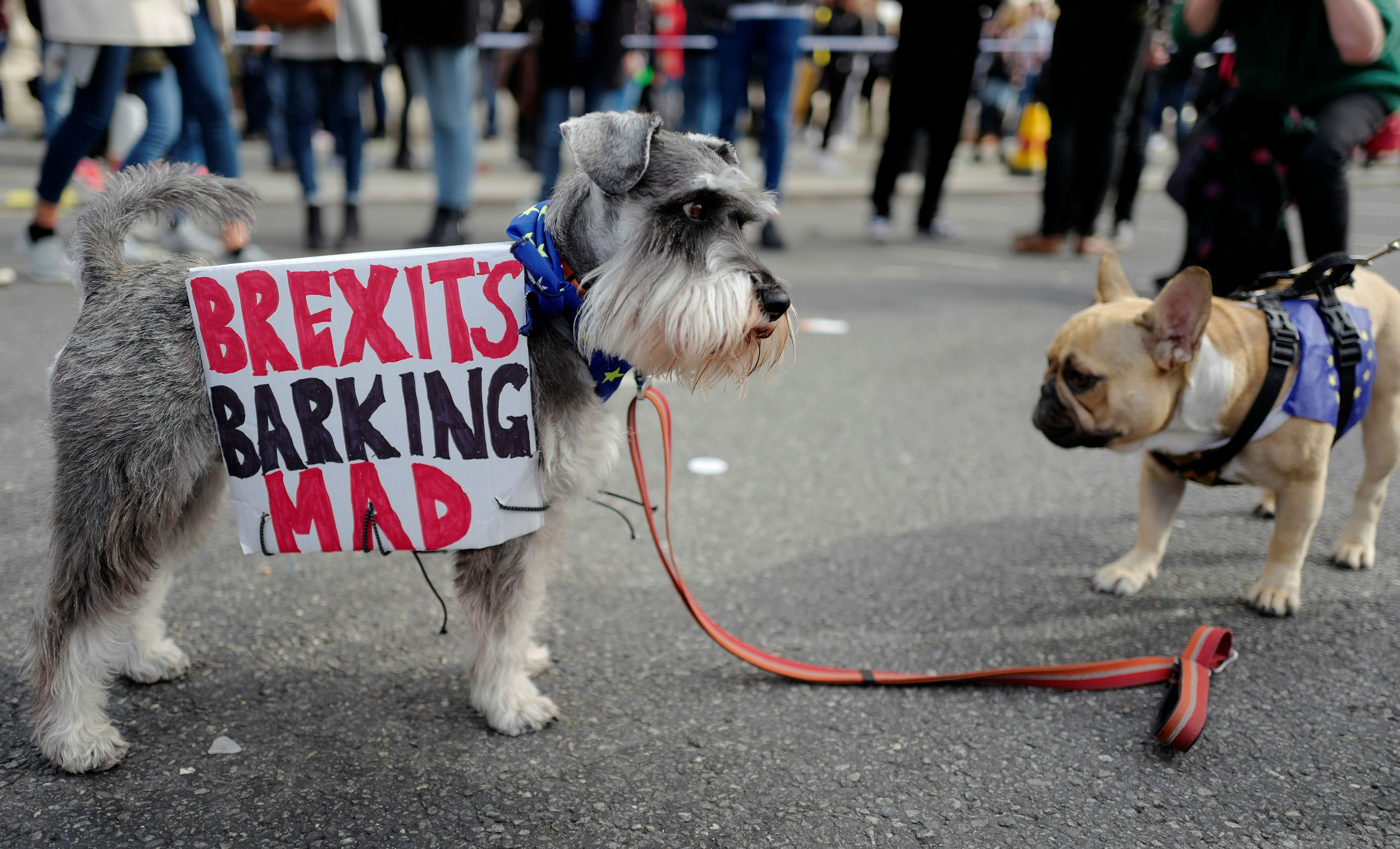 The two- and four-legged marchers displayed European Union flags and banners calling for a “wooferendum” during the walk to Parliament Square. Organizers said they were “howling on behalf of the millions of people in the UK who believe Brexit is a huge mistake”.