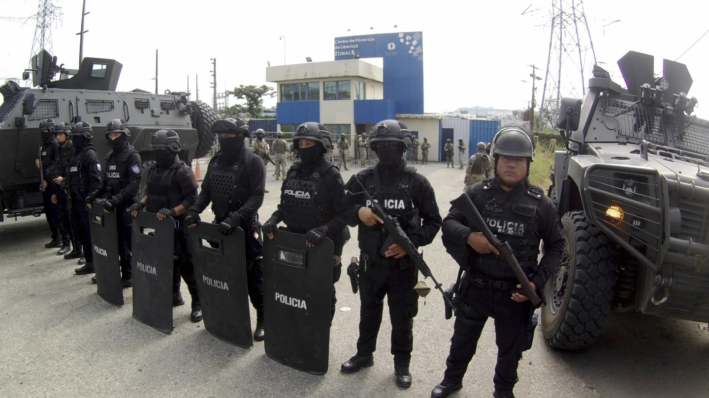 Ecuador Police above stand guard at the entrance to the Penitentiary where former Vice President Jorge Glas is being held...