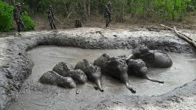 Rangers in a national park in northeastern Thailand rescued six baby elephants stranded in a mud puddle The animals could...